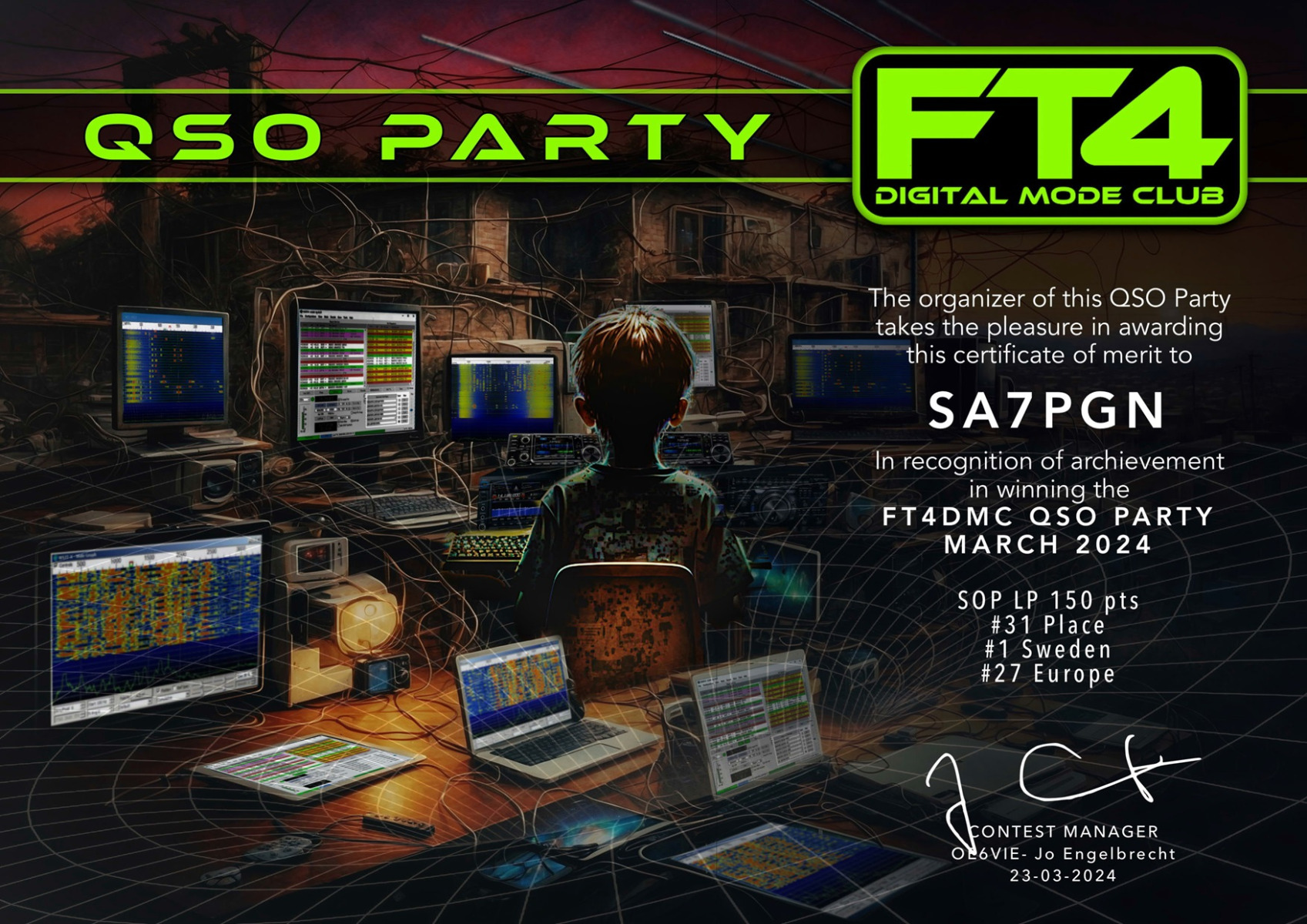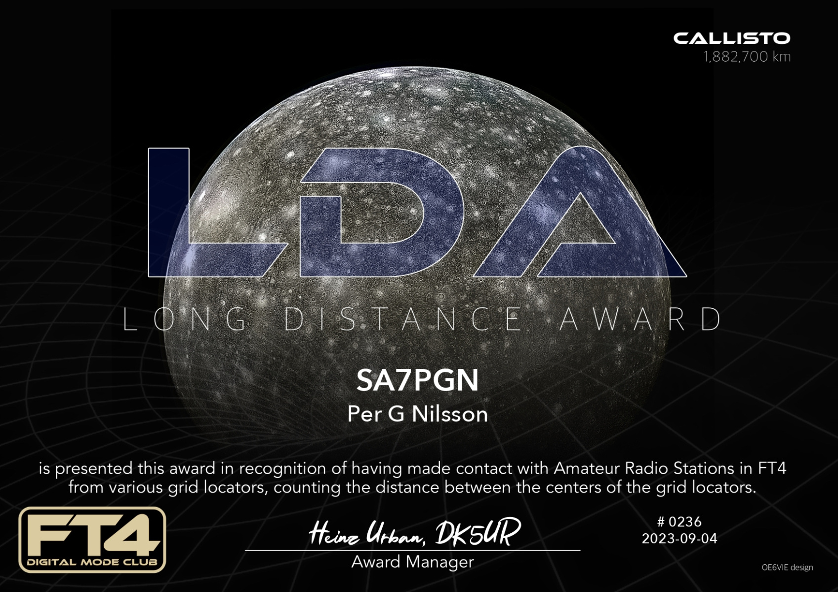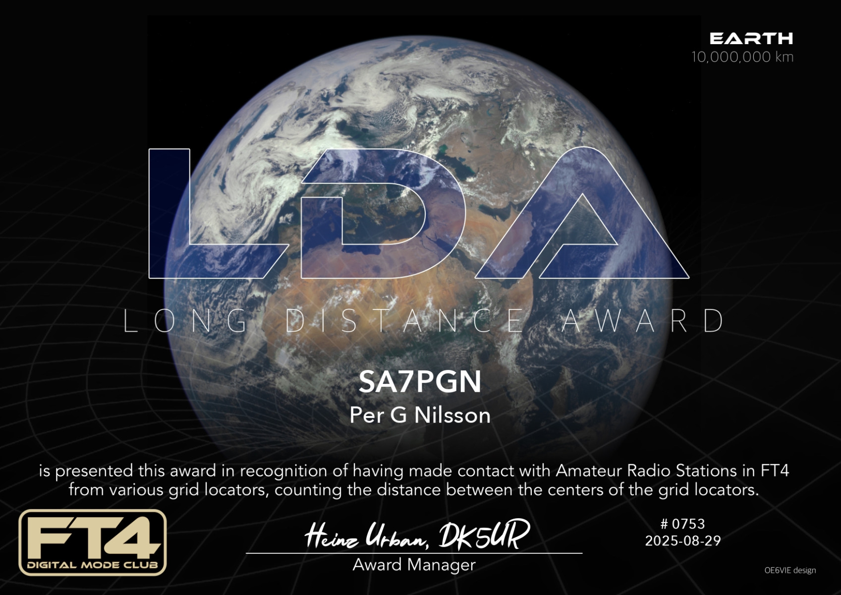 Just nu finns betydligt färre diplom framtagna än för FT8, men fler kommer successivt. Jag har just nu (2025-10-24) bara ett fåtal diplom, men jag jagar på för att få fler …….