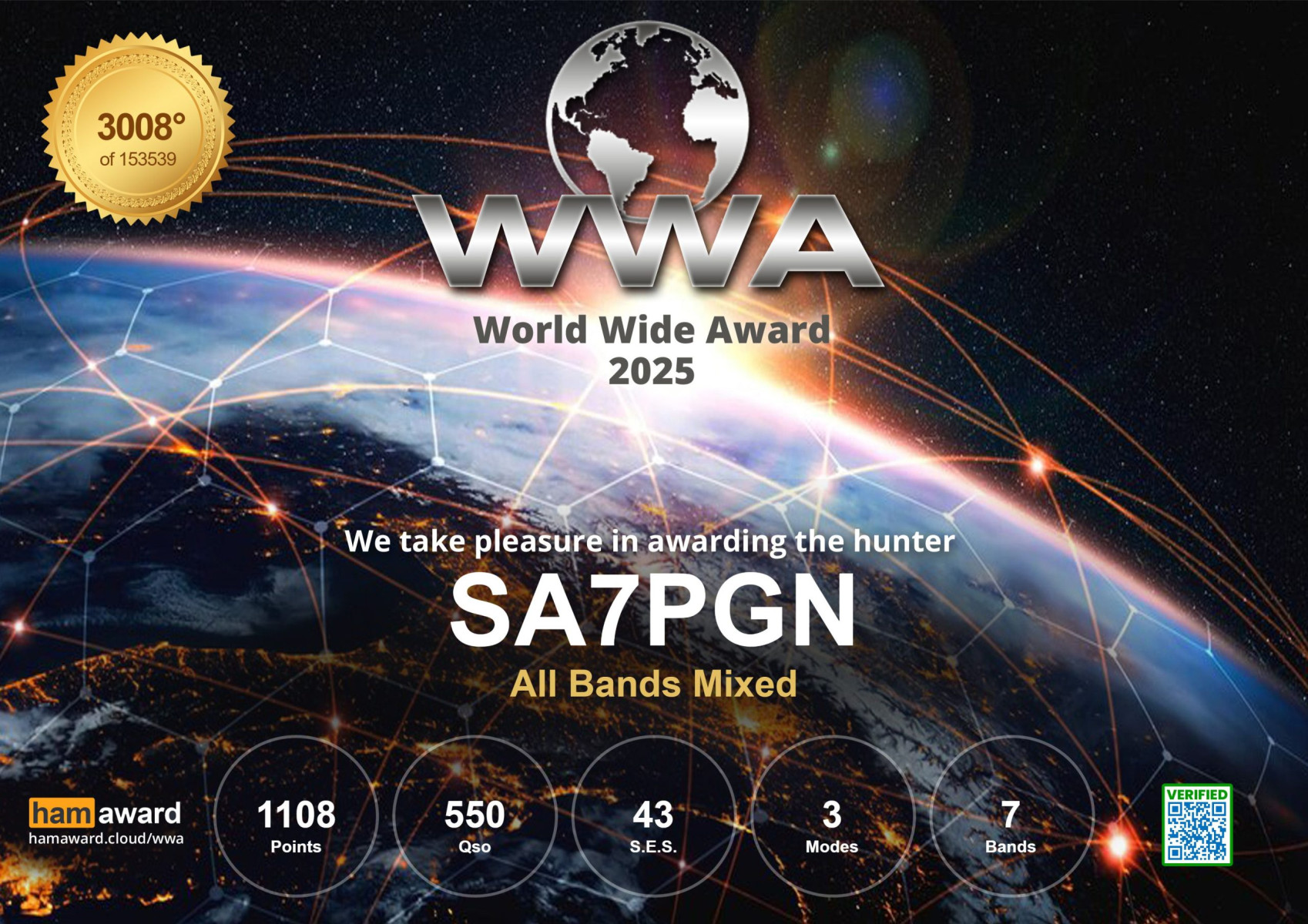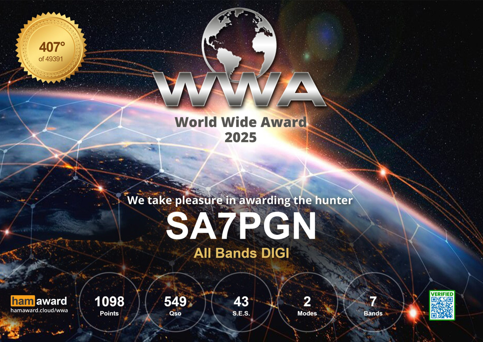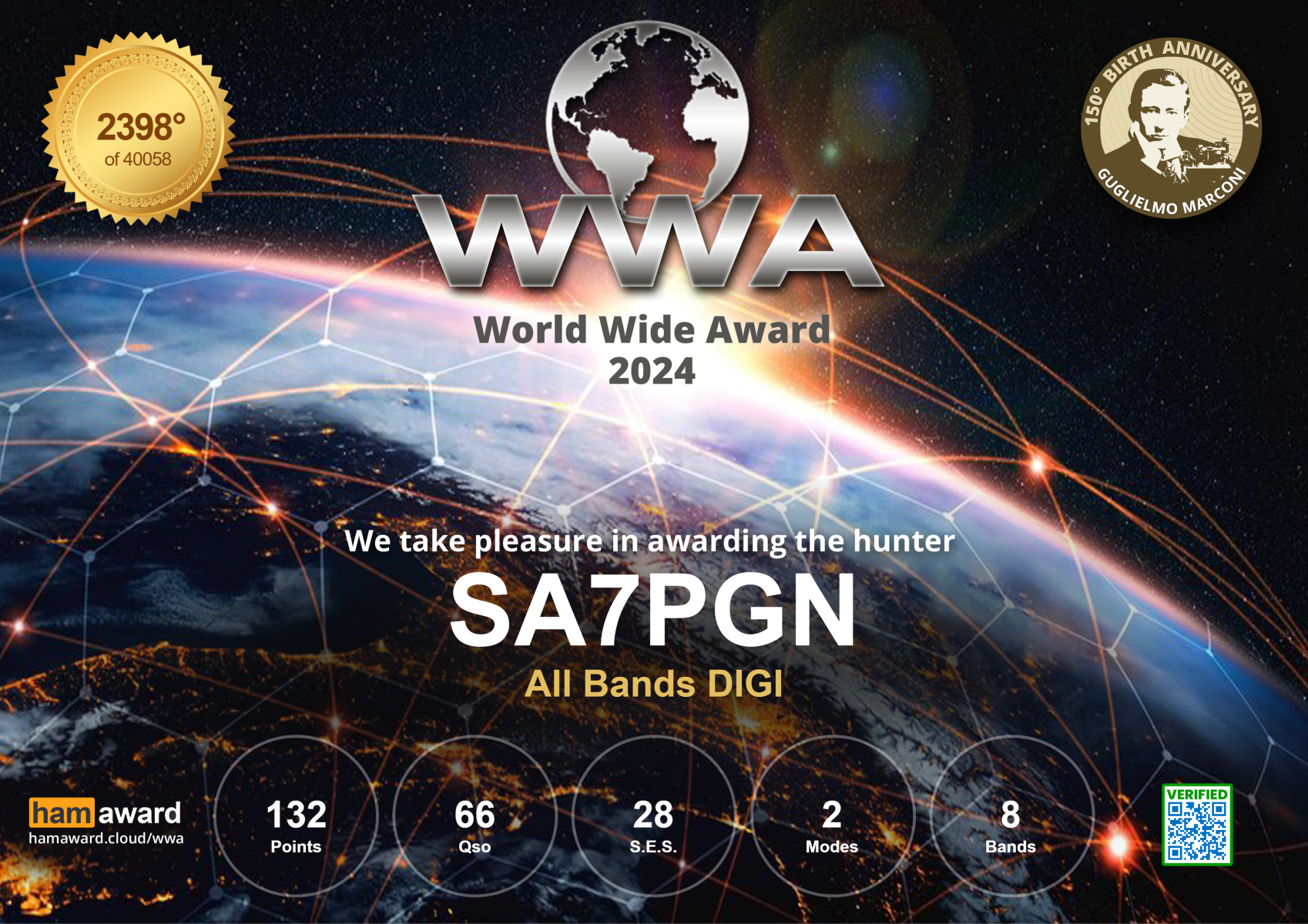 World Wide Award är det första internationella radioprojektet som syftar till att samla det största antalet länder i världen i en enda händelse, förutom de redan välkända världstävlingarna. Projektet föddes ur erfarenheten hos HamInnovation-teamet under de tre åren då de organiserade WRTC 2022, och är nu världens ledande radioevenemang när det gäller antalet QSO-anrop och aktivatorer. WWA har vuxit kontinuerligt sedan den första upplagan i januari 2024, och efter dess stora framgång beslutades det att organisera en snabbare upplaga, ”Sprint World Wide Award”, i juli. WWA ger ut ett diplom till sponsorer;